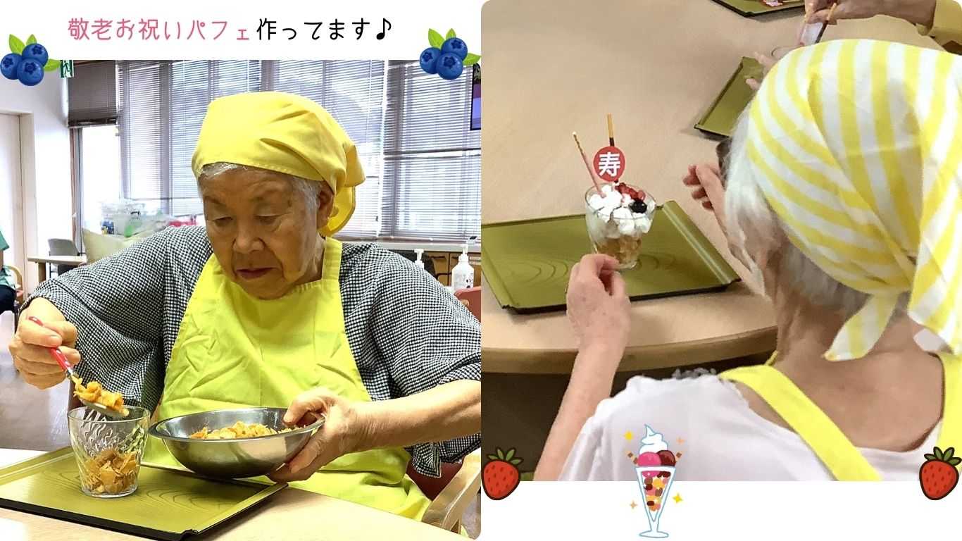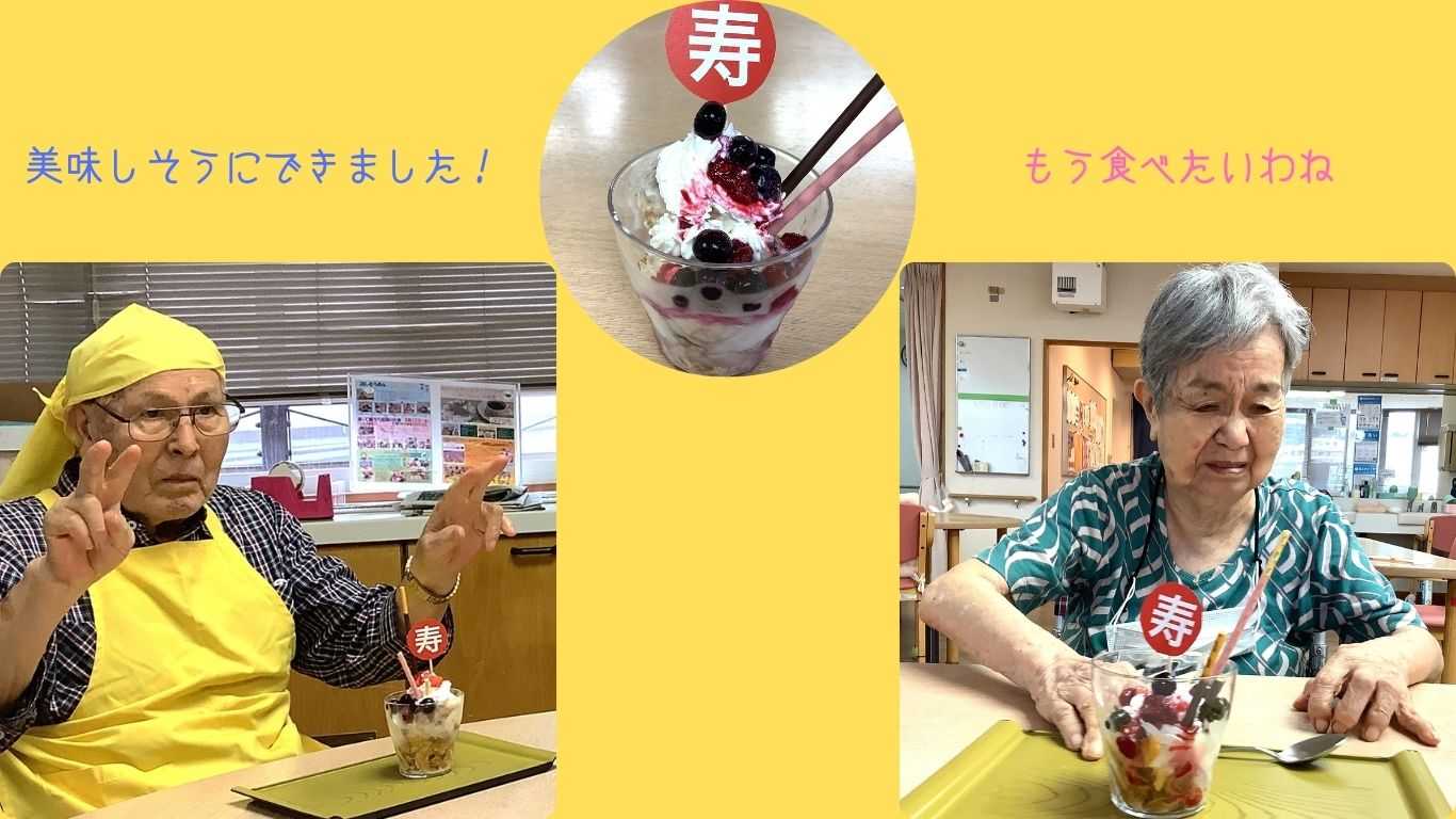 この日はおやつレクリエーションで『敬老お祝いパフェ』を作り、いただきました
