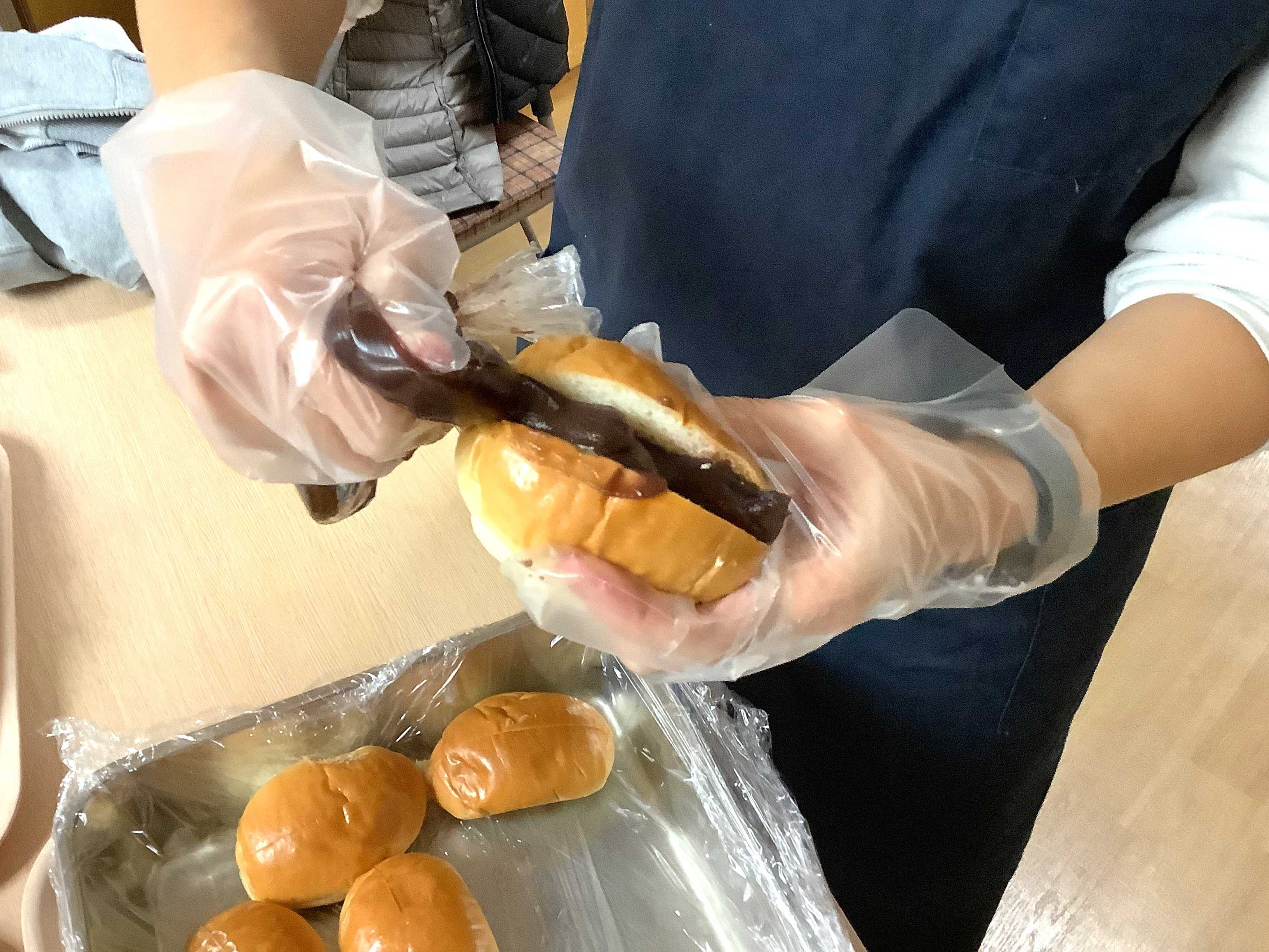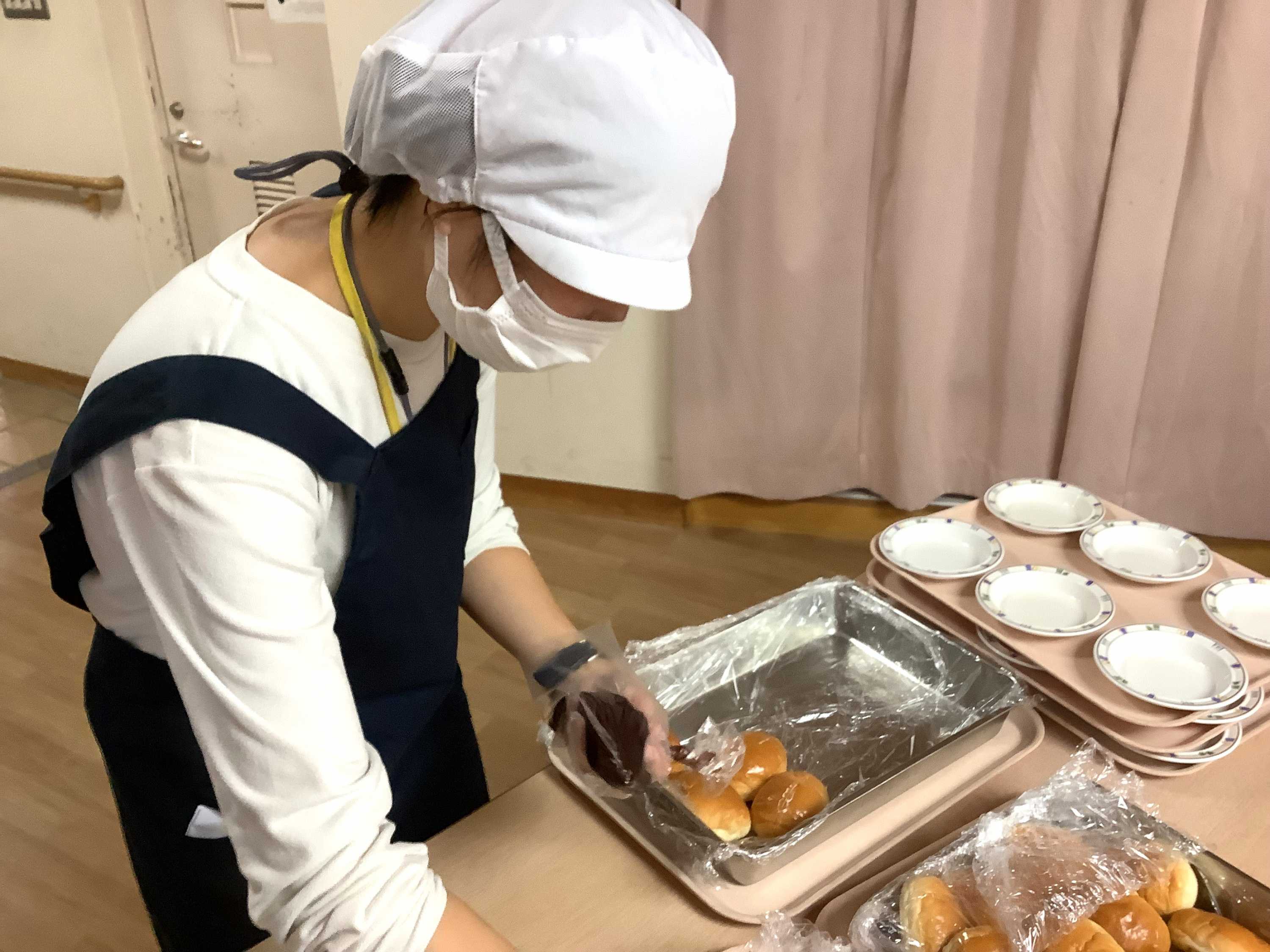 バターが入ったロールパンに、管理栄養士さん・厨房の職員さんがデイルームの