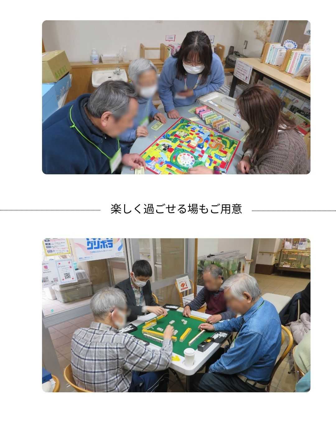麻雀やトランプ、ボードゲームなど、楽しく過ごせる場も