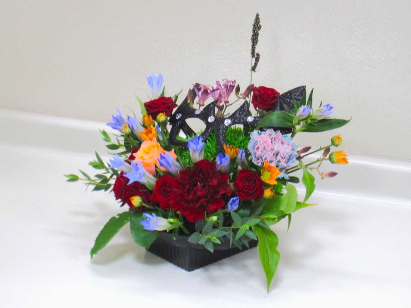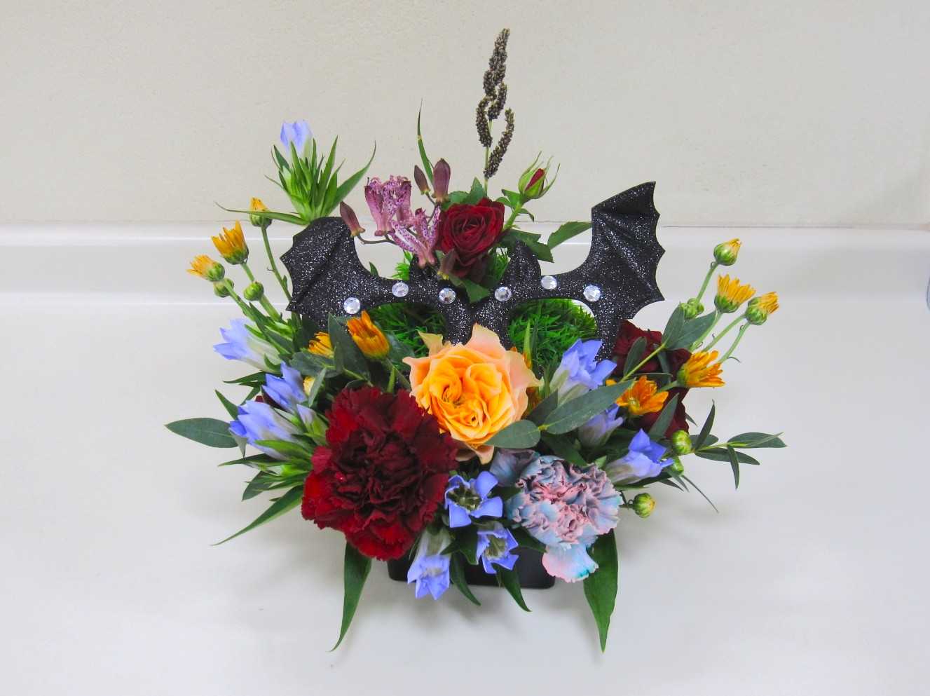10月のフラワーアレンジメントは、リンドウ・バラ・カーネーション等を花材に、